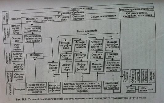 Технологический цикл изготовления планарных приборов включает в себя от 250 операций для транзисторов, и 1500 для интегральных схем. Наиболее общая классификация технологических операций включает в себя групповую и индивидуальную обработку изделия. Чем больше удельный вес групповых операций, тем лучше технико-экономические показатели определенного технологического метода.