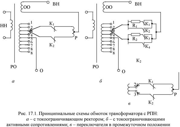 Принципиальные схемы одной фазы обмоток двухобмоточного транформатора с устройством РПН приведены на рис. 17.1. Здесь ОО – основная часть обмотки; РО – регулировочная часть обмотки, подключенная со стороны нейтрали трансформатора; К – контакторы; Р – токоограничивающий реактор; R – токоограничивающие активные сопротивления; 1–9 – ответвления регулировочной части обмотки. Нейтраль трансформатора О соединена со средним ответвлением. При установке переключателя в положение 5 в работе находится только основная часть обмотки ОО. Если переключатель находится в одном из положений 1–4, то к основной части обмотки ОО добавляется соответствующее число витков согласно включенной регулировочной части обмотки РО, в результате чего коэффициент трансформации увеличивается. В случае подключения переключателя к одному из ответвлений 6–9 к основной части обмотки ОО присоединяется некоторое количество встречно включенных витков, вследствие чего коэффициент трансформации уменьшается.