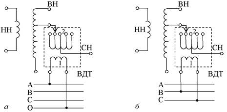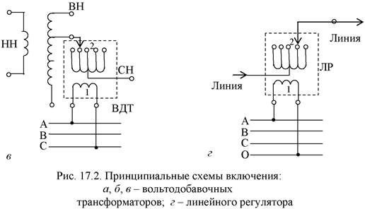 Принципиальные схемы включения одной фазы вольтодобавочных трансформаторов (ВДТ) на примере автотрансформаторов показаны на рис. 17.2, а, б, в. Схемы даны применительно к фазе А автотрансформатора. В зависимости от подаваемого напряжения на питающую обмотку 1 на регулировочной обмотке 2 будет создаваться продольная, поперечная и продольно-поперечная ЭДС. Так, при подключении питающей обмотки к фазе, соответствующей фазе автотрансформатора (в рассматриваемом случае к фазе А), и нейтрали автотрансформатора (рис. 17.12, а) будет создаваться продольная ЭДС, вектор которой совпадает с вектором напряжения данной фазы автотрансформатора. В результате на выходе СН автотрансформатора напряжение будет равно