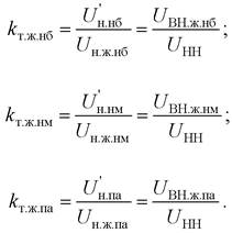 Трехобмоточный трансформатор сначала рассматривается как двухобмоточный в направлении ВН – НН, и для каждого режима электропотребления выбираются соответствующие ответвления устройства РПН в обмотке высшего напряжения с действительными напряжениями ответвлений U ВН.д.нб, U ВН.д.нм, U ВН.д.па. Эти ответвления будут удовлетворять требуемому режиму напряжений на шинах НН. Затем при фиксированных ответвлениях в обмотке ВН переходят к выбору ответвления в обмотке СН, рассматривая снова трехобмоточный трансформатор в направлении ВН – СН. При этом желаемый коэффициент трансформации может быть записан по параметрам нормальных режимов и параметрам обмоток трансформатора в виде