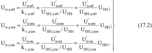 При выполнении расчетов на ЭВМ возможны различные способы выбора ответвлений трансформаторов. По первому способу на шинах ВН, СН и НН подстанции и в нулевой точке схемы замещения трехобмоточного трансформатора задают базисные напряжения, равные номинальному напряжению сети ВН, что соответствует коэффициенту трансформации, равному 1, и производят расчет режима. В результате определяют напряжения, приведенные к шинам ВН. Далее выбирают ответвления трансформаторов по формулам (17.1), (17.3).