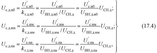 , приведенные к высшему напряжению (рис. 17.4, б). Как и для двухобмоточных трансформаторов, зададимся желаемыми напряжениями на шинах НН для каждого из рассматриваемых режимов U н.ж.нб, U н.ж.нм, U н.ж.па. При этом устройство РПН в обмотке высшего напряжения будем использовать, прежде всего, для обеспечения заданного режима напряжений на шинах НН. С учетом данного условия на шинах СН может быть задано только одно желаемое напряжение U с.ж для всех режимов, т. к. в обмотке среднего напряжения трансформатора нет устройства РПН.