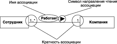 В качестве простого примера ненаправленной бинарной ассоциации можно рассмотреть отношение между двумя классами - классом Компания и классом Сотрудник. Они связаны между собой бинарной ассоциацией «Работает», имя которой указано на рисунке рядом с линией ассоциации. Для данного отношения определен следующий порядок чтения следования классов - сотрудник работает в компании.