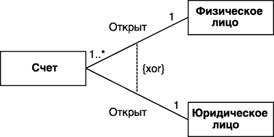 Частный случай отношения ассоциации - так называемая исключающая ассоциация (Xor-association). Семантика данной ассоциации указывает на то, что из нескольких потенциально возможных вариантов данной ассоциации в каждый момент времени может использоваться только один. На диаграмме классов исключающая ассоциация изображается пунктирной линией, соединяющей две и более ассоциации, рядом с которой записывается ограничение в форме строки текста в фигурных скобках: {xor}.