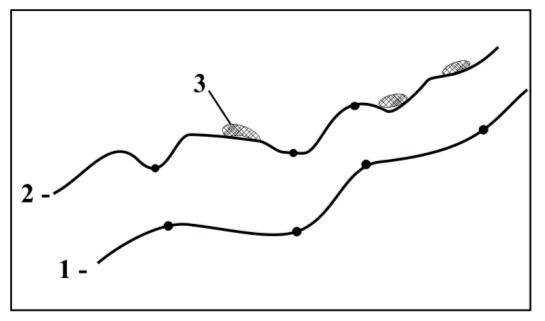 1 - тренд, 2 - случайные, но пространственно связанные высотные колебания, 3 - случайный шум.
