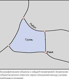 Пространственные отношения, такие как топологии и сети, являются очень важными частями базы данных ГИС. Топология применяется для контроля над общими границами между пространственными объектами, для определения и исполнения правил целостности данных, а также для поддержки топологических запросов и навигации (например, чтобы определить смежность и связность объектов). Топология также используется для расширенного редактирования и построения пространственных объектов на основе неструктурированных геометрических элементов (например, для построения полигонов из линий).