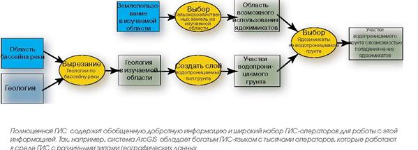 Следующий вид ГИС представлен коллекцией наборов географических данных и операторами (инструментами), применяемыми к этим наборам данных. Наборы географических данных могут представлять собой первичные “сырые” измерения (например, спутниковые снимки), интерпретированную и скомпилированную аналитиками информацию (например, дороги, сооружения или типы почв), либо информацию, полученную из других источников путем дополнительного анализа или моделирования. Геообработка связана с применением инструментов и процедур, используемых для генерирования производных наборов данных.
