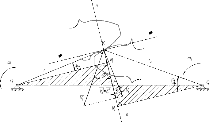 Формулировка анализа. Контактная нормаль к профилям высшей пары пересекает линию центров в полюсе относительного вращения звеньев.