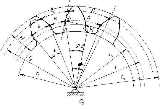 – делит зуб на ножку зуба и головку зуба. Делительной окружностью называется окружность стандартного шага, модуля и угла давления (или окружность, проходящая через точку эвольвенты для которой профильный угол