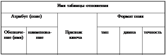 Логическая структура реляционной таблицы определяется в соответствии с реквизитным составом информационных объектов. В структуре реляционной таблицы каждый столбец (поле) соответствует одному из реквизитов в заданной последовательности. Ключевые реквизиты информационных объектов образуют уникальный ключ реляционной таблицы. Для каждого столба должен быть определен формат данных – тип данного (символьное, число, дата и т.п.), а также его размер.
