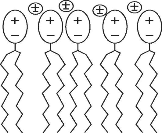 ной головки и углеводородного хвоста. Этот хвост представляет собой две цепочки атомов углерода, в которых к каждому из атомов углерода присоединены один или два атома водорода. По своему составу и строению эти цепочки сродни молекулам парафина и тоже не смачиваются водой, гидрофобны. Дипольные головки, напротив, гидрофильны, так как их диполи могут притягиваться к диполям воды. На рисунке 11.2 показан разрез участка мономолекулярного слоя липидного матрикса.