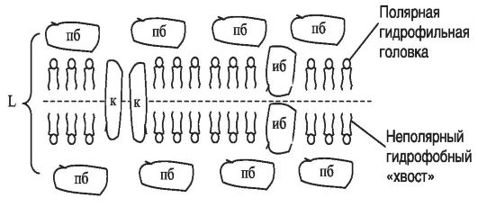 L - толщина мембраны; пб - поверхностные белки; иб - интегральные белки; к - белки, формирующие ионный канал (пору)