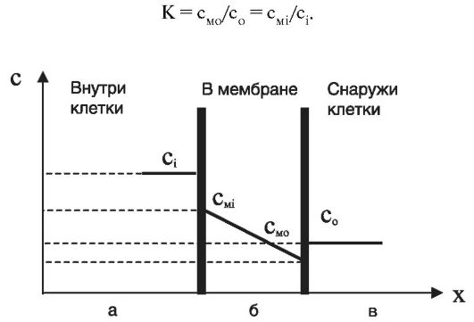 Коэффициент распределения вещества между мембраной и окружающей средой равен коэффициенту распределения вещества между мембраной и клеткой:
