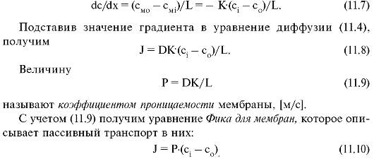 Учитывая малую толщину мембраны (L), можно считать, что концентрация молекул диффундирующего вещества изменяется в ней линейно. Поэтому градиент концентрации диффундирующего вещества постоянен: