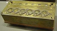 Эту машину называли «Паскалина». Она состояла из набора вертикально установленных колес с нанесенными на них цифрами от 0 до 9. При полном обороте колеса оно сцеплялось с соседним колесом и поворачивало его на одно деление. Число колес определяло число разрядов – так, два колеса позволяли считать до 99, три – уже до 999.