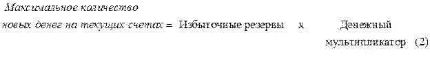 Максимальное количество новых денег,которое может быть создано системой коммерческих банков на основе определенного количества избыточных резервов, выражается формулой: