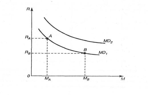 Отложим на вертикальной оси номинальную ставку процента, а на горизонтальной оси - количество денег в обращении. Функциональная зависимость указанных переменных выражается кривыми MD1и MD2, соответствующими различным уровням номинального национального дохода (MD1 - меньшему, а МD2 - большему уровню).