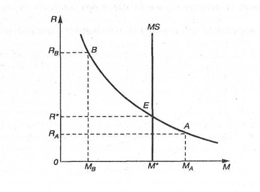 Если ставка процента поднимется выше равновесного уровня, то хозяйствующие субъекты пожелают держать в форме денег сумму Мв, меньшую, чем М*. При этом банковская система будет избавляться от излишних денег, скупая ценные бумага. Цены последних поднимутся, а процентная ставка снизится с уровня Rb до уровня R*.