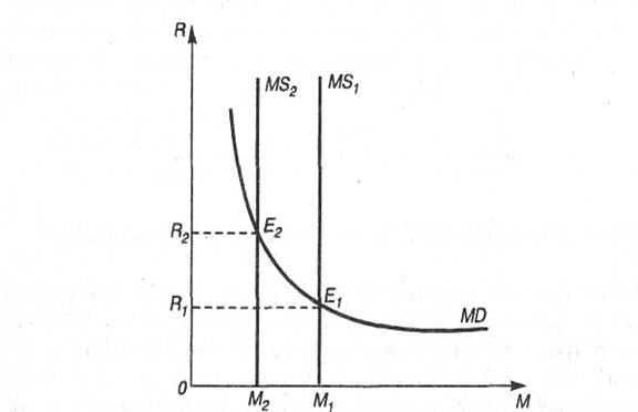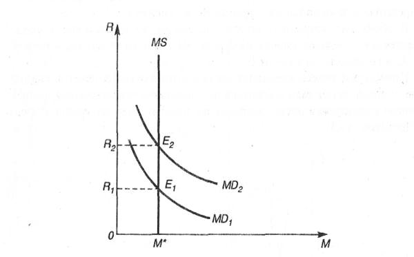 Будем исходить из равновесного состояния E1. При процентной ставке R1 увеличение номинального национального дохода увеличит спрос на деньги, что выразится в сдвиге кривой спроса на деньги из положения MD1 в положение MD2. Увеличение спроса на деньги будет побуждать хозяйствующих субъектов продавать ценные бумаги, а также брать деньги в ссуду, что вызовет понижение рыночной цены ценных бумаг и повышение ставки процента. В условиях стабильного предложения денег состояние равновесия Е2 возможно в том случае, если процентная ставка повысится до уровня R2, при котором величина спроса на деньги соответствует их предложению.