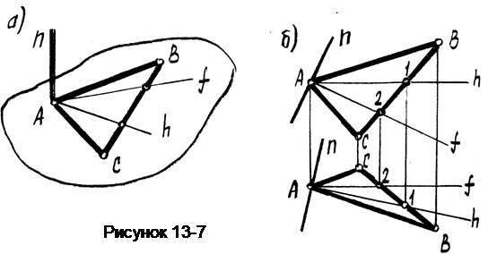 Проводим в плоскости Б произвольные горизонталь h и фронталь f.