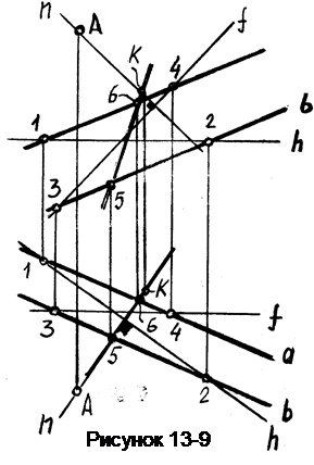 Пример 5. Определить расстояние от т. А до плоскости общего положения Б(a//b), (рисунок 13-9).