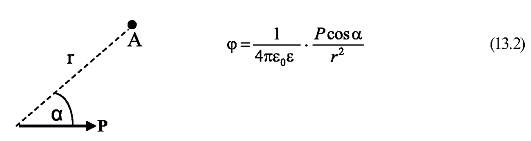 Абсолютная величина потенциала зависит от дипольного момента Р, диэлектрической проницаемости среды ε и от положения данной точки поля относительно диполя. Пусть диполь находится в непроводящей бесконечной среде и некоторая точка А удалена от его центра на расстояние r >> λ (рис. 13.2). Обозначим через α угол между вектором Р и направлением на эту точку. Тогда потенциал, создаваемый диполем в точке А, определяется следующей формулой: