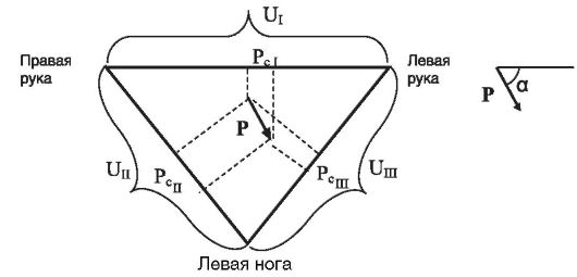Отведение I (правая рука - левая рука), отведение II (правая рука - левая нога), отведение III (левая рука - левая нога). Им соответствуют разности потенциалов UI, UII, UlII. Направление вектора Рс определяет электрическую ось сердца. Линия электрической оси сердца при пересечении с направлением I-го отведения образует угол α. Величина этого угла определяет направление электрической оси сердца.