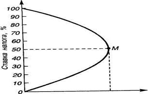 Согласно кривой Лаффера рост налоговых ставок приводит к увеличению массы налоговых поступлений лишь до определенных пределов (точка М). Дальнейшее увеличение налоговой ставки приведет к чрезмерному налоговому бремени. Это сократит доходы предприятий, возможности расширения производства, тем самым в долгосрочном периоде затормозит рост ВВП и валового национального дохода. В результате сократится налогооблагаемая база, что приведет к падению доходов государственного бюджета. Увеличение налогового бремени может привести к уходу с рынка многих производителей из-за банкротств и к уклонению остальных хозяйств от налогов, что также сократит возможности государственного бюджета.