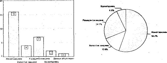 Данные о распределении переменной можно представить не только в форме таблиц, но и в форме графиков, которые еще более наглядны. Рассмотрим четыре типа графиков, которые чаще всего используются в случае одномерного распределения. Для неупорядоченных категорий (шкала наименований) обычно применяют столбиковые диаграммы. Число столбиков соответствует числу категорий. Высота каждого столбика отражает частоту встречаемости данной категории. Все столбики рисуются одинаковой ширины и не соприкасаются друг с другом. Порядок их расположения на горизонтальной оси может быть любым. Для представления долей и процентов удобны круговые диаграммы. Весь круг соответствует единице или ста процентам, а величина каждого сектора отражает представительство соответствующей категории.