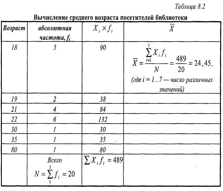 В таблице 8.2 показано, как вычислить средний возраст для выборки из 20 посетителей библиотеки. Заметьте, что каждое значение просто умножается на свою абсолютную частоту.