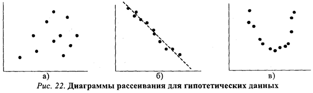 Очевидно, что на рисунке 22а какая-либо связь между x и y попросту отсутствует. На рисунке 22б воображаемая прямая линия (отмечена пунктиром) пересекла бы диаграмму сверху вниз, из левого верхнего в правый нижний угол. Иными словами, линейная связь в этом случае имеет обратное направление: чем больше X, тем меньше зависимая переменная У.