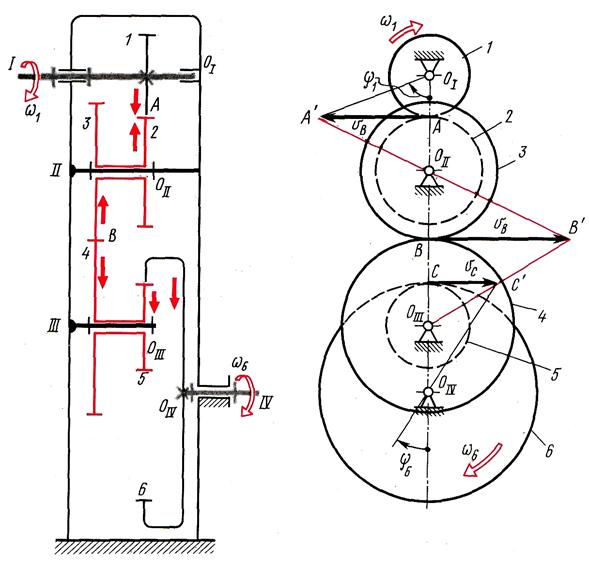 Рассмотрим кинематику ступенчатого механизма составленного из трех зубчатых передач: двух внешнего зацепления (1-2) и (3-4) и одной внутреннего зацепления(5-6). Схема механизма изображена на рис.