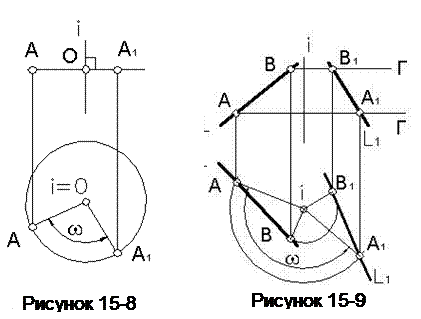 39.1 При вращении вокруг горизонтально-проецирующей прямой i (рисунок 15-8) горизонтальная проекция точки А перемещается по окружности, а фронтальная – по прямой, перпендикулярной фронтальной проекции оси і (являющейся фронтальной проекцией плоскости вращения Г). При этом расстояние между горизонтальными проекциями двух точек А и В (рисунок 15-9) при их повороте на один и тот же угол ω остается неизменным (АВ=А1В1).