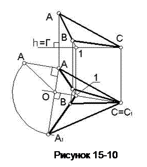 39.2 Если в качестве оси вращения взять линию уровня, то истинную величину плоской фигуры общего положения можно построить одним поворотом. На рисунке 15-10 построено изображение ∆АВС(А1В1С1) после поворота его вокруг горизонтали h (С,1) до положения, совмещенного с горизонтальной плоскостью уровня ГÎ h. Так как горизонталь проходит через точку С, то последняя неподвижна при вращении треугольника. Нужно повернуть только точки А и В вокруг горизонтали до совмещения их с плоскостью Г.