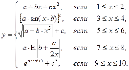 5..6: y:=sqrt(abs(a+b*x*sqr(x)))+c;