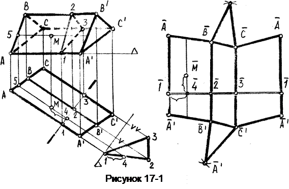 Пример 1. Построить полную развёртку поверхности треугольной призмы (рисунок 17-1) и нанести на ней точку М, принадлежащую поверхности.