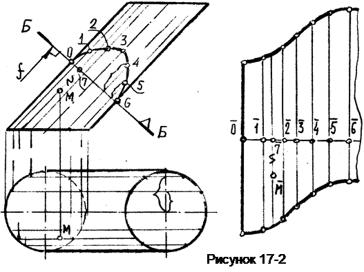 Чтобы построить на развёртке точку М, наносим сначала на ней положение образующей, на которой эта точка лежит. Для этого измерим на натуральном виде нормального сечения хорду от точки 1 до точки 7, в которой эта образующая пересекается с плоскостью Б, и отложим её на развёртке. На проведённой через полученную точку 7 образующей откладываем отрезок, измеренный на виде спереди от нормального сечения до точки М.