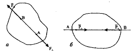 Две силы, приложенные к абсолютно твердому телу, будут уравновешены, если равны по модулю и действуют по одной прямой в противоположных направлениях (рис 4, а, б).