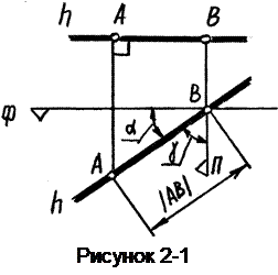 Прямая, параллельная горизонтальной плоскости, называется горизонталью, h // Г (рисунок 2-1). На фронтальной проекции (виде спереди) она всегда перпендикулярна вертикальным линиям связи, а на виде сверху составляет с ними некоторый угол α (реконструкцией чертежа определяем положение прямой в пространстве). На виде сверху отрезок АВ, взятый на прямой, изображается в натуральную величину; здесь же можно определить угол α наклона прямой к фронтальной плоскости и угол γ - наклона ее к профильной плоскости.