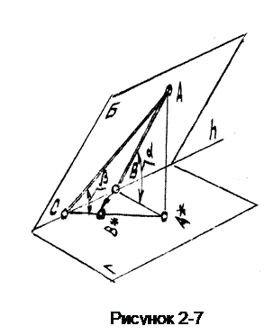 Действительно, если провести в плоскости Б(рисунок 2-7) прямую АВ, перпендикулярную к горизонтали h этой плоскости и произвольную прямую АС, то нетрудно показать, что прямая АВ образует больший угол наклона с горизонтальной плоскостью Г, нежели прямая АС.Покажем, что a > b.