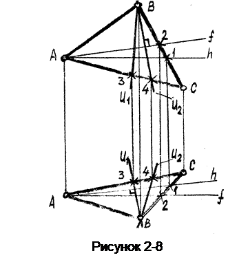 Пример 1. Провести в плоскости Б (D АВС) через точку В прямые наибольшего уклона U1 и U2 к горизонтальной и фронтальной плоскостям (рисунок 2-8). Сначала строим ЛНУ к горизонтальной плоскости. Для этого в заданной плоскости Б проведем горизонталь h - например А-1;На предыдущем рисунке 3- 2 видно, что перпендикулярность к h сохраняется и на виде сверху (аналогично перпендикулярность к f сохраняется на виде спереди; пока без доказательства).