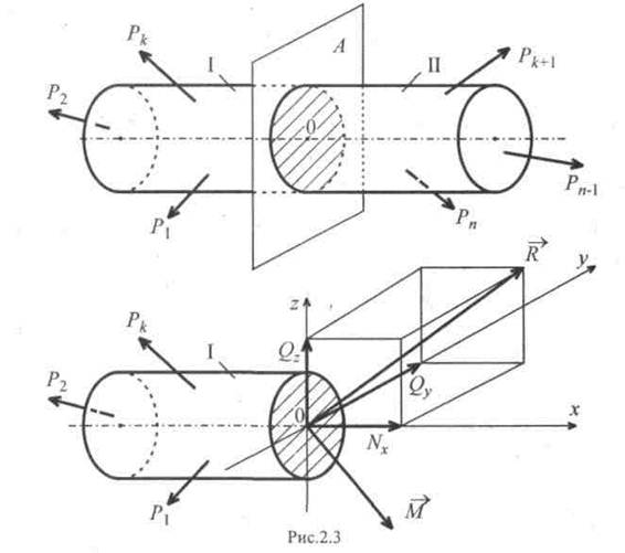 Брус плоскостью А мысленно разделим на две части. На этом же рисунке представлена рассматриваемая часть бруса I. На рис. 2.3. обозначены: