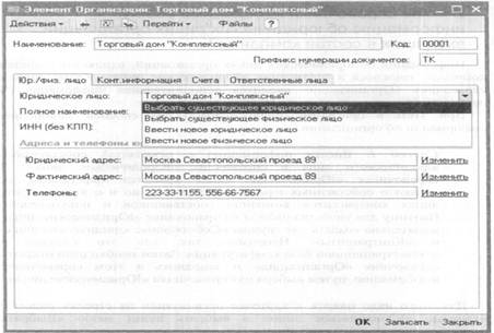 Информацию о сотрудниках (в частности о руководителе, главном бухгалтере) можно внести в этот справочник заранее, а можно дополнить этот справочник в процессе ввода информации об организации. Следует обратить внимание на тот факт, что информация об ответственных лицах организации хранится в регистре сведений и является периодической.
