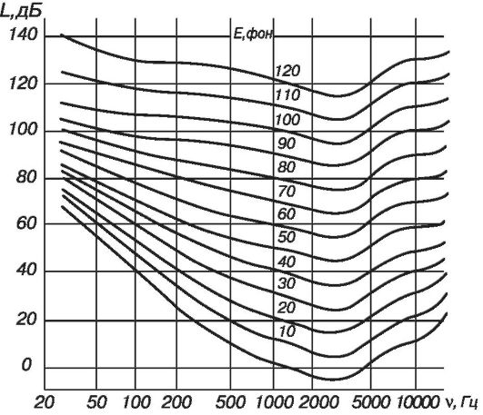 Детальную связь между частотой, громкостью и уровнем интенсивности изображают графически с помощью кривых равной громкости (рис. 3.3). Эти кривые демонстрируют зависимость уровня интенсивности LдБ от частоты ν звука при заданной громкости звука.