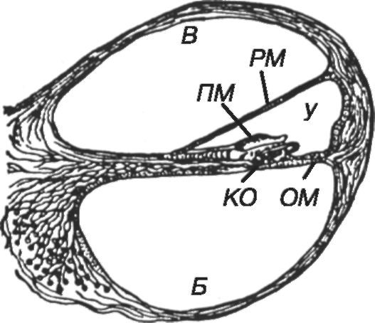 Рис. 4.6. Схематическое строение улитки, содержащей каналы: В - вестибулярный; Б - барабанный; У - улитковый; РМ - вестибулярная (рейснерова) мембрана; ПМ - покровная пластина; ОМ - основная (базилярная) мембрана; КО - кортиев орган
