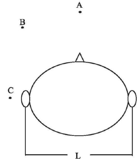 Рис. 4.7. Различная локализация источника звука (А, В, С) в горизонтальной плоскости: L - расстояние между ушными раковинами