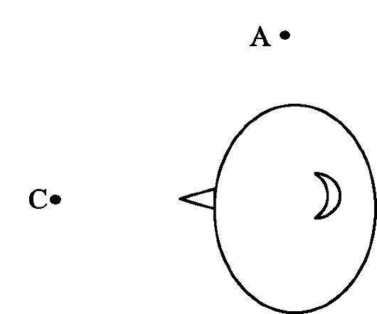 Рассмотрим теперь случай, когда источник звука расположен в вертикальной плоскости, ориентированной перпендикулярно прямой, соединяющей оба уха. В этом случае он одинаково удален от обоих ушей и разности фаз не возникает. Значения интенсивности звука, попадающего в правое и левое ухо, при этом совпадают. На рисунке 4.8 показаны два таких источника (А и С). Различит ли слуховой аппарат эти источники? Да. В данном случае это произойдет благодаря особой форме ушной раковины, которая (форма) способствует определению локализации источника звука.
