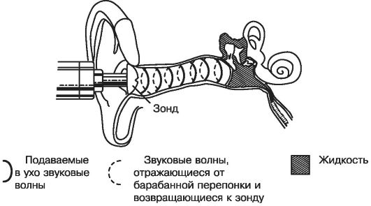 Исследование начинается с установки зонда с надетым на него ушным вкладышем, который герметично перекрывает слуховой проход в начале наружного слухового прохода. Через зонд в слуховом проходе создается избыточное (+) или недостаточное (-) давление, а затем подается звуковая волна определенной интенсивности. Дойдя до барабанной перепонки, волна частично отражается и возвращается к зонду (рис. 4.9).