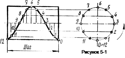 Из пространственных кривых наиболее часто встречается на практике цилиндрическая винтовая линия. Если точка совершает равномерное движение по прямой, которая в свою очередь совершает равномерное вращение вокруг параллельной ей оси, то она (точка) опишет пространственную кривую – цилиндрическую винтовую линию (рисунок 5-1).