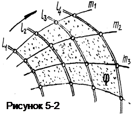 В начертательной геометрии пользуются, в основном, кинематическим способом образования поверхностей, т.е. движением линии (рисунок 5-2). Поверхность Ф представляет собой множество последовательных положений l1, l2, l3 и т.д. линии l, форма и движение которой подчинены некоторому закону. Линия l называется образующей. Линии, по которым она движется, называют направляющими – m1, m2, m3 и т.д.
